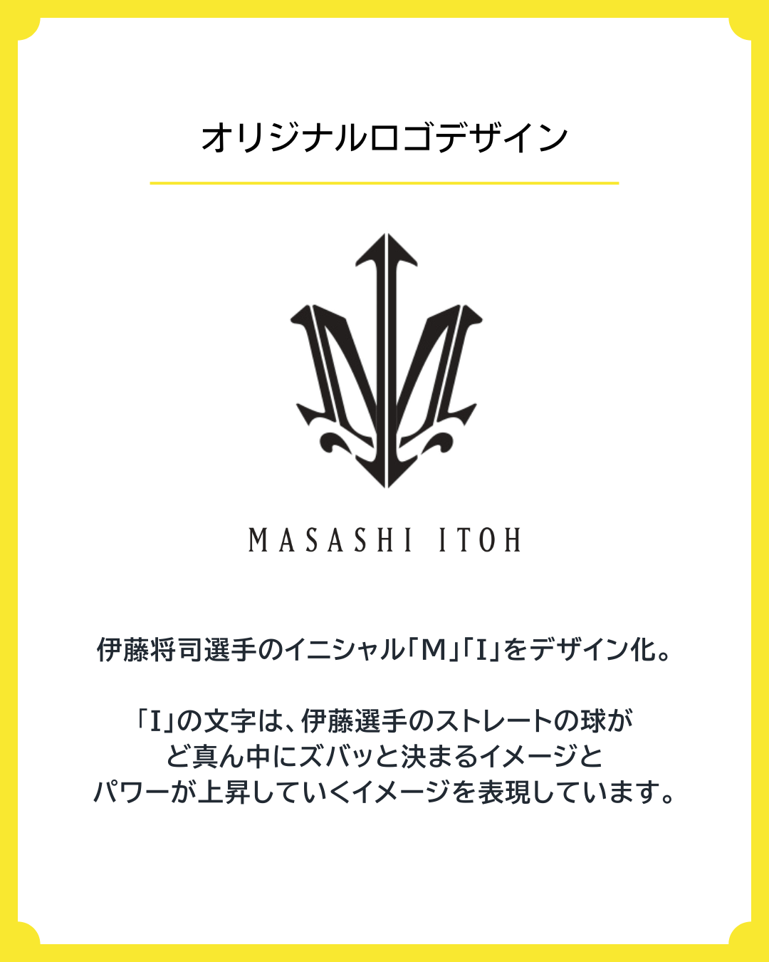 オリジナルロゴは、伊藤選手ご本人監修のもと作成され、イニシャルである「M」「I」をモチーフにデザイン化したものです。中でも「I」の文字は、伊藤選手のストレートがど真ん中にズバッと決まるイメージや、パワーが上昇していく力強さが表現されています。